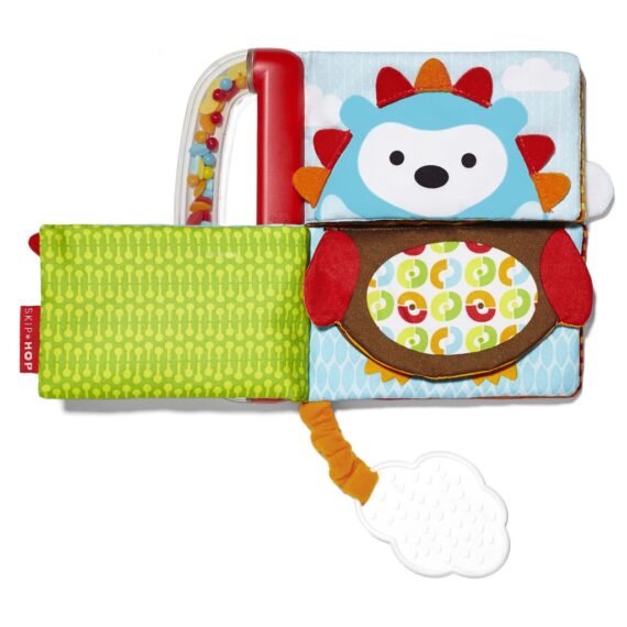 Knižka se ľahko drží vďaka plastovému držadlu, ktoré je zároveň aj hrkálkou. Obsahuje textúrované hryzadlo. Každá stránka v sebe skrýva prekvapenie. Jednotlivé “stránky” knižôčky šuštia, ježkovi píska nos, sovička v sebe ukrýva detské zrkadielko.