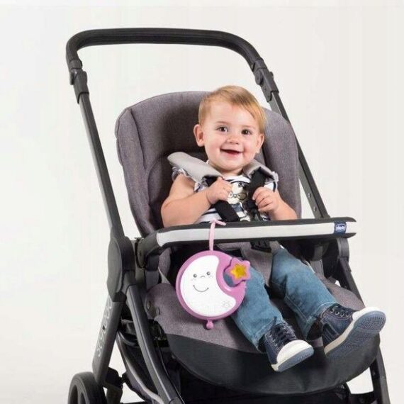 – ODNÍMATEĽNÝ ELEKTRONICKÝ BOX: Odnímateľná a prenosná hudobná skrinka so svetielkom v tvare mesiačika slúži ako hudobná hračka – dá sa zavesiť na bok postieľky, ale napríklad na kočík