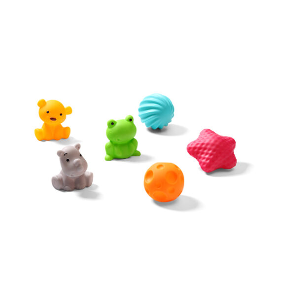 Senzorické hračky sú kombináciou hračky a edukačnej pomôcky. Pomáhajú zdokonaľovať koordináciu ruka-oko a stimulujú rozvoj zmyslov dieťatka. Súčasťou sady sú 3 loptičky a 3 zvieratká. Každá senzorická hračka má inú farbu a štruktúru. Nielenže sa používajú na hranie a podnecujú zvedavosť, ale skvele poslúžia aj na jemnú masáž. Bábätko ich môže hrýzť pri prerezávaní zúbkov. Vyrobené z hygienického silikónu. Senzorické hračky sa dodávajú v praktickej taške na prepravu alebo skladovanie.