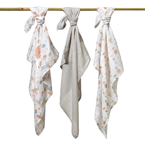 Súprava obsahuje 3 plienky: 2 z nich sú ozdobené farebnými potlačami a jedna je jednofarebná.