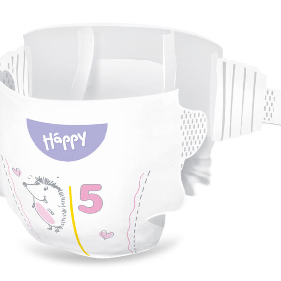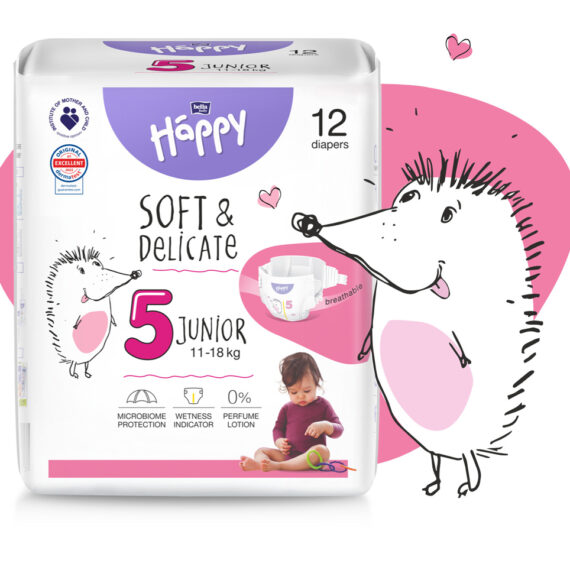 Detské plienky Happy Soft & Delicate Junior (5) sú odporúčané pre novorodencov s hmotnosťou 15 a viac kilogramov. Sú vyrobené z najkvalitnejších materiálov, dokonale sa prispôsobia telu dieťatka a poskytujú príjemný pocit sucha. Sú navrhnuté tak, aby vyhovovali potrebám tej najcitlivejšej pokožky – neobsahujú žiadne alergény a minimalizujú riziko vzniku zaparenín.