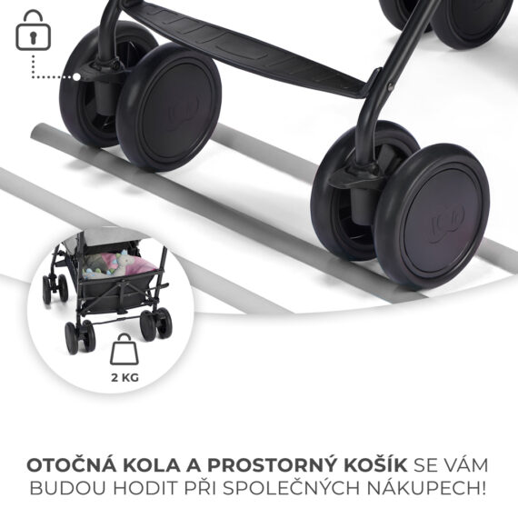– Dobre manipulovateľné kolesá – sú vyrobené z neprepichnuteľnej peny. Nevyžadujú si hustenie, sú ľahké a uľahčujú vedenie kočíka. Predné kolesá majú blokádu pre rovnú jazdu, čo bude užitočné v ťažšom teréne.