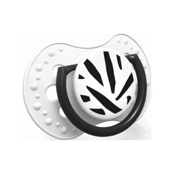 Je vyrobený z bezpečného materiálu, ktorý neobsahuje BPA. Jedinečný okraj štítku je vyrobený zo zdravotníckeho materiálu, je príjemný na dotyk a zabraňuje otlačenie cumlíka. Otvory vo štítku umožňujú cirkuláciu vzduchu, eliminujú hromadenie slín za štítkom a tým predchádzajú podráždenie citlivej detskej pokožky. Krúžok v cumlíku pevne drží, uľahčuje držanie a podávanie cumlíka. Môžete naň pripnúť retiazku alebo šnúrku.