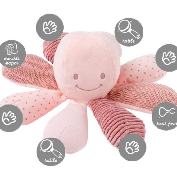 Táto chobotnička sa stane prvým skutočným kamarátom Vášho bábätka, ktorá ho upokojí, dodá pocit bezpečia a komfortu. Chobotnička je vhodným kamarátom pre Vaše bábätko od jeho narodenia, a bude ho sprevádzať celým jeho detstvom, ako verný spoločník a kamarát. Chobotnička je vyrobená z jemného a na dotyk príjemného materiálu.