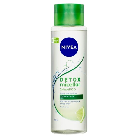 Nivea® Detoxikačný micelárny šampón s organickým zeleným čajom, limetkou a micelárnou technológiou pre unavené vlasy a pokožku hlavy. Obnovuje zdravie vlasov a pokožku hlavy, dodá im novú energiu a hydratuje ich. Chráni prirodzené pH pokožky hlavy, nevysušuje. Jemné čistiace micely účinne odstraňujú nečistoty.