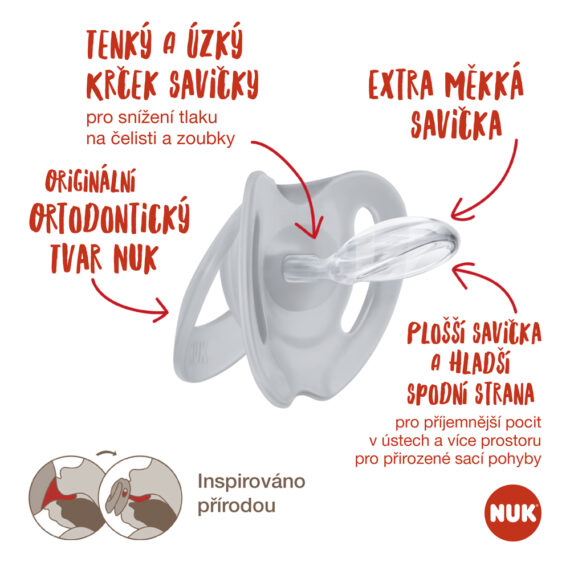 – Vylepšený tvar cumlíka NUK – cumlík má rovnaký tvar ako matkina bradavka pri dojčení, dokonale padne do úst dieťaťa pri saní