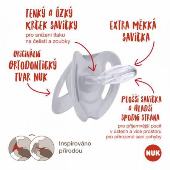 Cumlík NUK Star je v ústach bábätka naozaj mäkký. Obzvlášť mäkká zóna na hornej strane cumlíka (namiesto s stenčenou vrstvou silikónu) sa ešte pohodlnejšie pritlačí k poschodiu.