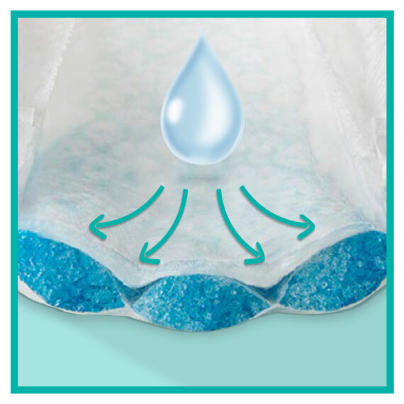 1) Vďaka rýchloschnúcemu jadru okamžite absorbujú tekutinu, 2) bezpečnostné manžetky okolo nožičiek pomáhajú predchádzať pretečeniu okolo nožičiek, 3) flexibilné bočné krídelká sa pohodlne prispôsobia pásu dieťatka, čo zaručí bezpečné priliehanie a dokonalú ochranu proti úniku cez deň aj v noci bez ohľadu na to, ako sa dieťatko pohybuje.