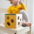 Súprava obsahuje drevenú kocku so štyrmi stranami na triedenie a 12 farebných kociek rôznych tvarov, napríklad trojuholníka, hviezdy, štvorca, kosoštvorca alebo kruhu.