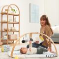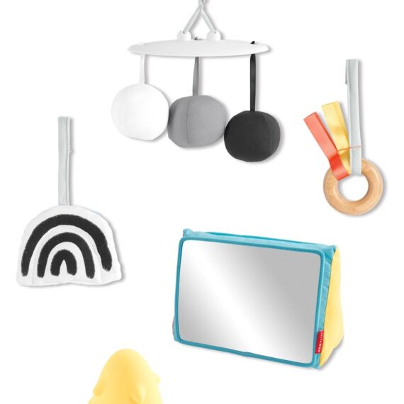 – 5 vývojových hračiek obsahuje: guličky usporiadané do stupnice, zrkadlo, drevený krúžok, dúhová hrkálka a hryzačku v tvare stromu.