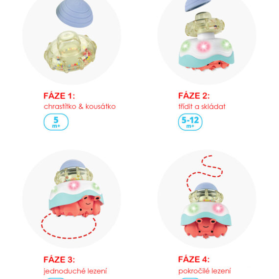 – Štvrtý režim pokročilý” sa krab plazí v náhodnom vzore. Počas pohybu dopredu sa pancier nakláňa dozadu a krab z neho prekvapene vykúka. Keď krab spomalí alebo zastaví, stiahne sa späť do panciera. Hračka odmeňuje dieťatko svetielkami, hudbou (vrátane 3 piesní) a zvukmi (6 zvukových efektov), čo prispieva k zábave a stimulácii jeho zmyslov.