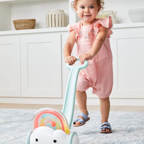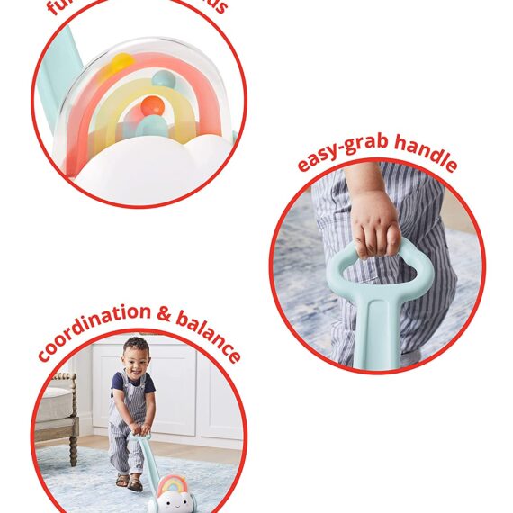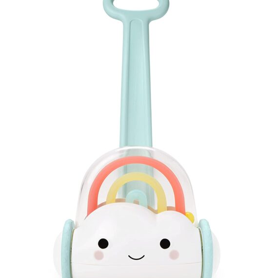 Klasická hračka na tlačenie s veselým dizajnom obláčika a dúhy s korálkami. Deťom zabezpečí veselú a zábavnú oporu pri prvých dobrodružných krôčikoch. Dúha s farebnými loptičkami odmení dieťa za každý krok zábavnými praskavými zvukmi. Skvelý spôsob, ako si pri hre vybudovať istotu pri chôdzi, hrubú motoriku, rovnováhu a ďalšie zručnosti.