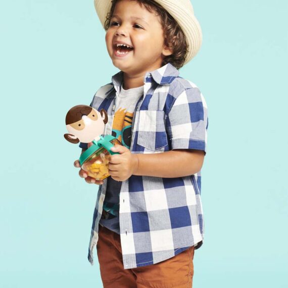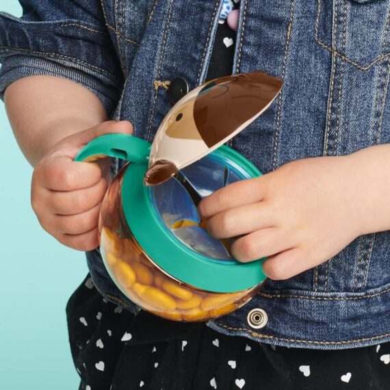 Šikovný nápad na cesty. Nádoba má viečko, ktoré po otvorení drží, pred vysypaním obsahu ho chránia pružné lamely, ktoré pustia detskú ručičku dovnútra, ale nepustia desiatu von. Nádoba je priehľadná, aby sa mohla zavčasu doplniť. Na boku je praktické uško v detskom rozmere, pomocou ktorého možno nádobu pripevniť aj na kočík či tašku. 0% BPA, 0% PVC, bez ftalátov. Obsah: 222 ml. Priemer: 10 cm