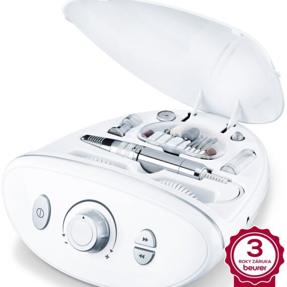 Manikúrová a pedikúrová stanica Beurer MP 100 od nemeckého výrobcu Beurer je prístroj na úpravu nechtov.Vďaka profesionálnej sade na manikúru a pedikúru Beurer MP 100 dosiahnete krásnych nechtov na rukách i nohách bez návštev drahých salónov. Všetko ľahko, rýchlo a v pohodlí domova.Je vhodný ako pre umelé tak pre prírodné nechty, čo zaistí všestranné použitie. Navyše ho môžu bez obáv používať aj ľudia s diabetom.Rozmery produktu sú 22×23,5×11 cm a jeho hmotnosť je 995g, takže nebude problém ho v čase, keď ho nebudete používať, ľahko uskladniť.Súprava na úpravu nechtov sa zvládne otáčať ako po smere hodinových ručičiek, tak i proti ich smeru. Vďaka tomu budú vaše nechty vždy vyzerať, ako od profesionálov.Ochranný kryt zabraňuje víreniu prachu z nechtov, takže už nikdy nebudete musieť dýchať nezdravý prach, ktorý pri ich úprave vzniká.Sada zvládne vyvinúť až 20.000 otáčok za minútu,PríslušenstvoZafírový kužeľ jemný – je vhodný pre odstraňovanie suchej a stvrdnutej kože alebo otlakov.Zafírový kužeľ hrubý – je vhodný k rýchlemu odstráneniu veľkej vrstvy stvrdnutej kože alebo otlakov.Zafírový kotúč jemný – je vhodný pre pilovanie a úpravu nechtov.Zafírový kotúč hrubý – je vhodný pre pilovanie a úpravu nechtov.Valcová frézka – je vhodná pre obrúsenie nedokonalého povrchu nechtov na nohách.Frézka plamienkového tvaru – je vhodná pre odstránenie zarastených nechtov.Zafírová frézka guľatá – je vhodná pre odstránenie kurích ôk.Frézka na nechty – je vhodná pre uvoľnenie zarastených nechtov.Plstený kužeľ – je vhodný pre uhladenie a vyleštenie okrajov nechtov. Charakteristika a technické údaje: na profesionálnu starostlivosť o nechty a nohy max. výkon až 20 000 ot / min plynulo nastaviteľná rýchlosť beží v smere hodinových ručičiek / proti smeru hodinových ručičiek 10 vysoko kvalitných zafírových a plstených príloh 30 jednosmerných príloh ochranný kryt pre nechtový prach s protišmykovým povrchom rukoväte bezpečnostný zámok vhodné pre diabetikov jednoduché použitie vhodný aj na umelé nechty sieťová prevádzka obsahuje integrovaný úložný priestor adaptéra rýchlosť: 5 000 – 20 000 ± 15% otáčok za minútu vstup: 100-240 V / 50/60 Hz / 1,2 A výstup: 15 V / 2,3 A