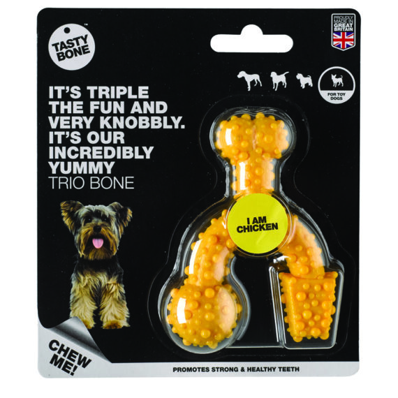 Trojnásobná zábava. Neuveriteľne lahodná trio kostička. Rovnako ako všetky nylonové maškrty TastyBone i táto bola testovaná na tých najenergickejších maškrtníkoch.