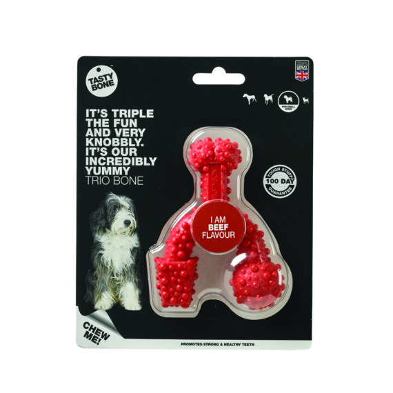 Trojnásobná zábava. Neuveriteľne lahodná trio kostička. Rovnako ako všetky nylonové maškrty TastyBone i táto bola testovaná na tých najenergickejších maškrtníkoch.