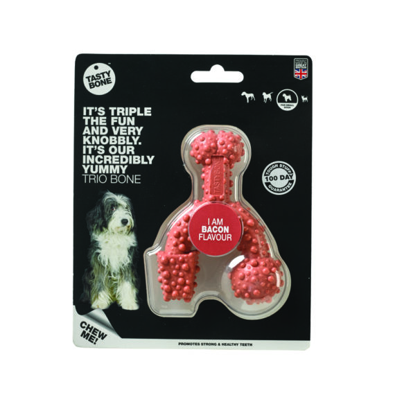 Trojnásobná zábava. Neuveriteľne lahodná trio kostička. Rovnako ako všetky nylonové maškrty TastyBone i táto bola testovaná na tých najenergickejších maškrtníkoch.