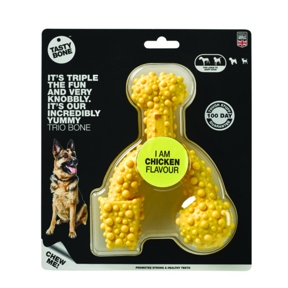 Trojnásobná zábava. Neuveriteľne lahodná trio kostička. Rovnako ako všetky nylonové maškrty TastyBone i táto bola testovaná na tých najenergickejších maškrtníkoch.