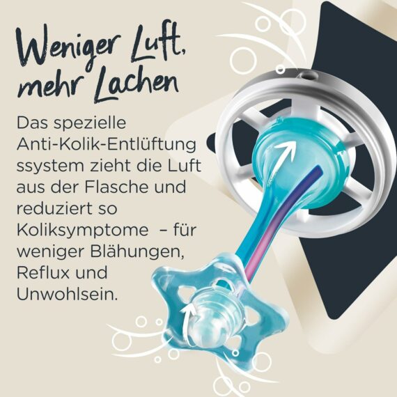 Hlavným prvkom fľaše je trojdielny antikolikový systém, ktorý sa skladá z ventilového ventilu, rúrky a tepelného snímača. Tento systém funguje tak, že ventil v cumlíku odvádza vzduch do rúrky, kde prechádza cez mlieko, čím znižuje tvorbu vzduchových bublín. To pomáha minimalizovať prehltnutie vzduchu počas kŕmenia, čo je často príčinou kolík.